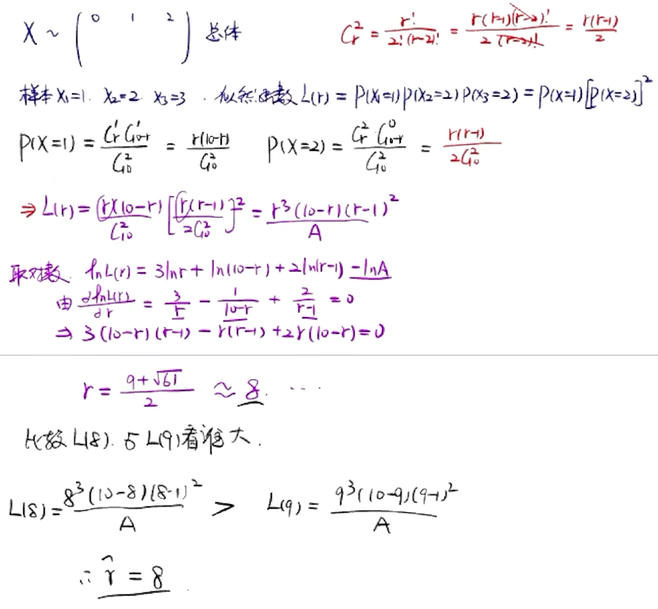设某箱中有 10 个产品,其中正品的个数为l.从中任取两个产品,记为两个产品中正品的个数,现对 独立观察三次,结果为1,2,2,则未知参数 的极大似然估计值